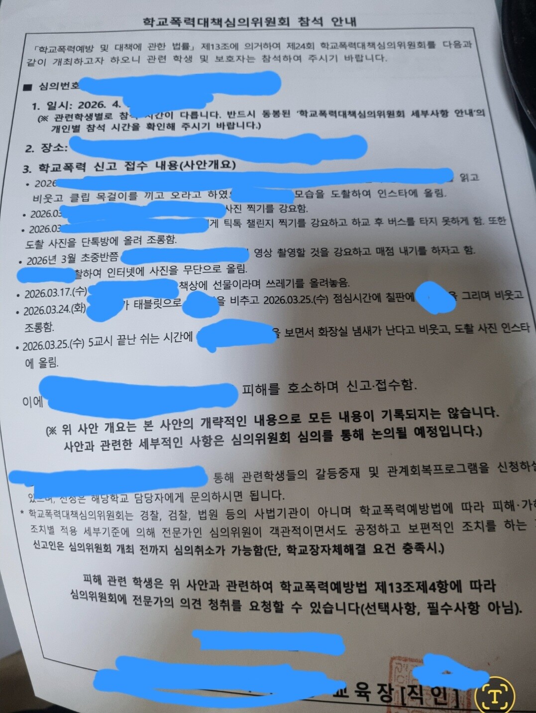 오늘 교육청에서 학폭심의열린다고