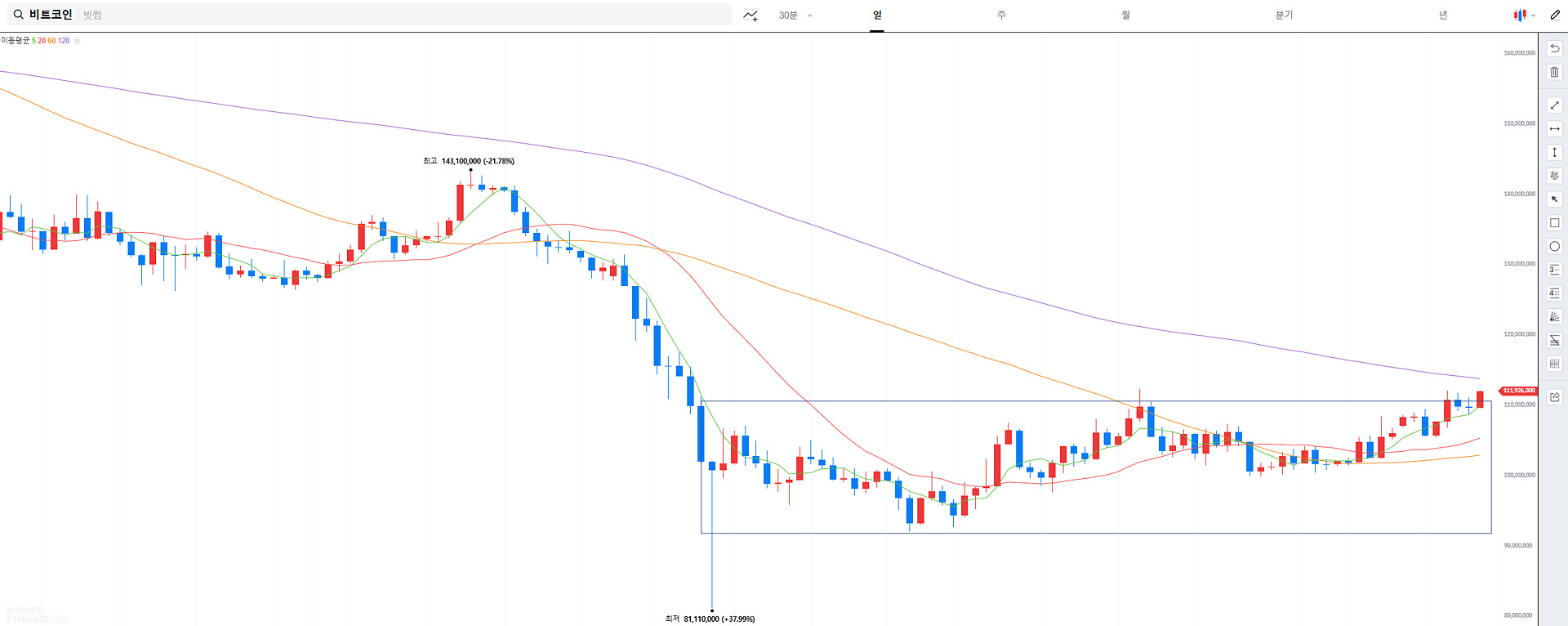 현재 비트코인은 박스권 상단을 두드리는중이고 저 박스권을 뚫고 올라간다면 다음주 한국 코스피도 전고점을 넘지 않을까 싶습니다~