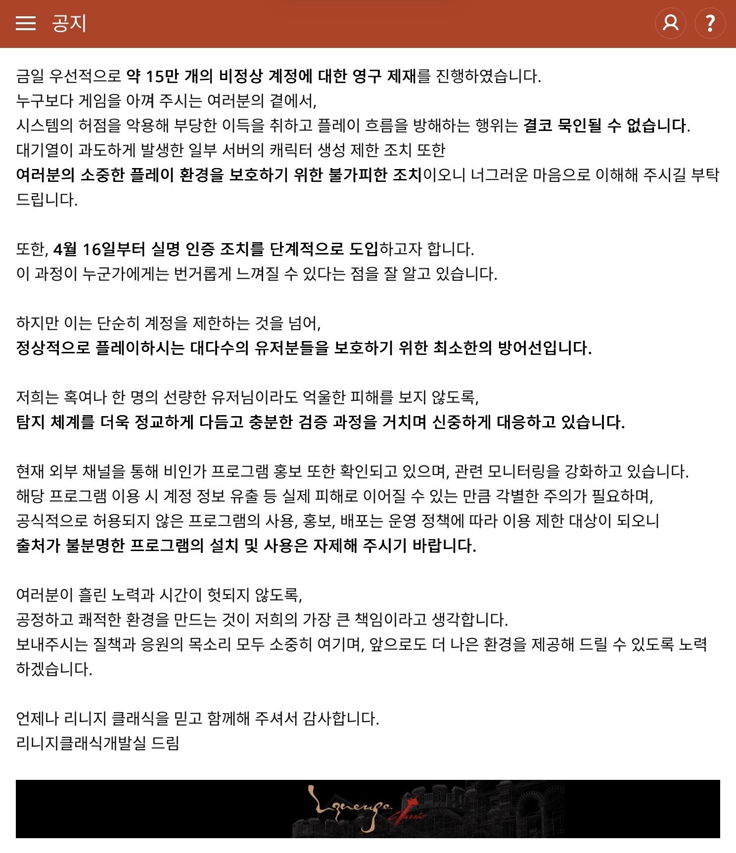 15만 개의 계정을 해당일에 영구 제재했다고 알렸으며 본인인증 절차를 강화해 나가겠다고 하였습니다. 해당일 오후까지는 불법 자동 캐릭터의 수가 30% 수준으로 줄어들었으나, 며칠이 지난 현시점에는 이전보다 더 많아졌음을 느끼고 있습니다.