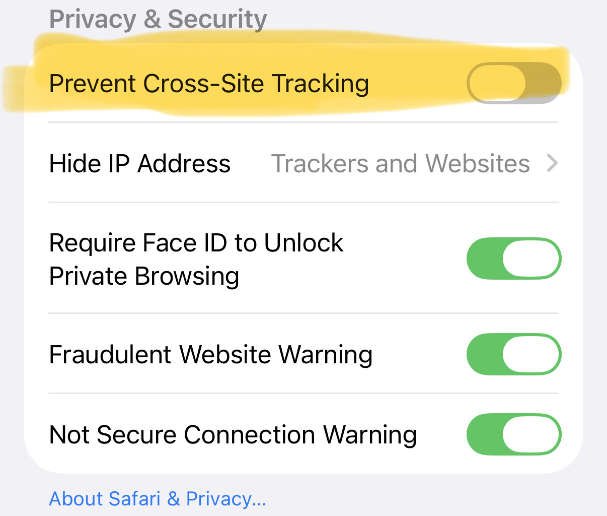 설정->앱->사파리->사생활&보안에서 사생활보호기능중 하나인 사진의 형광처리된