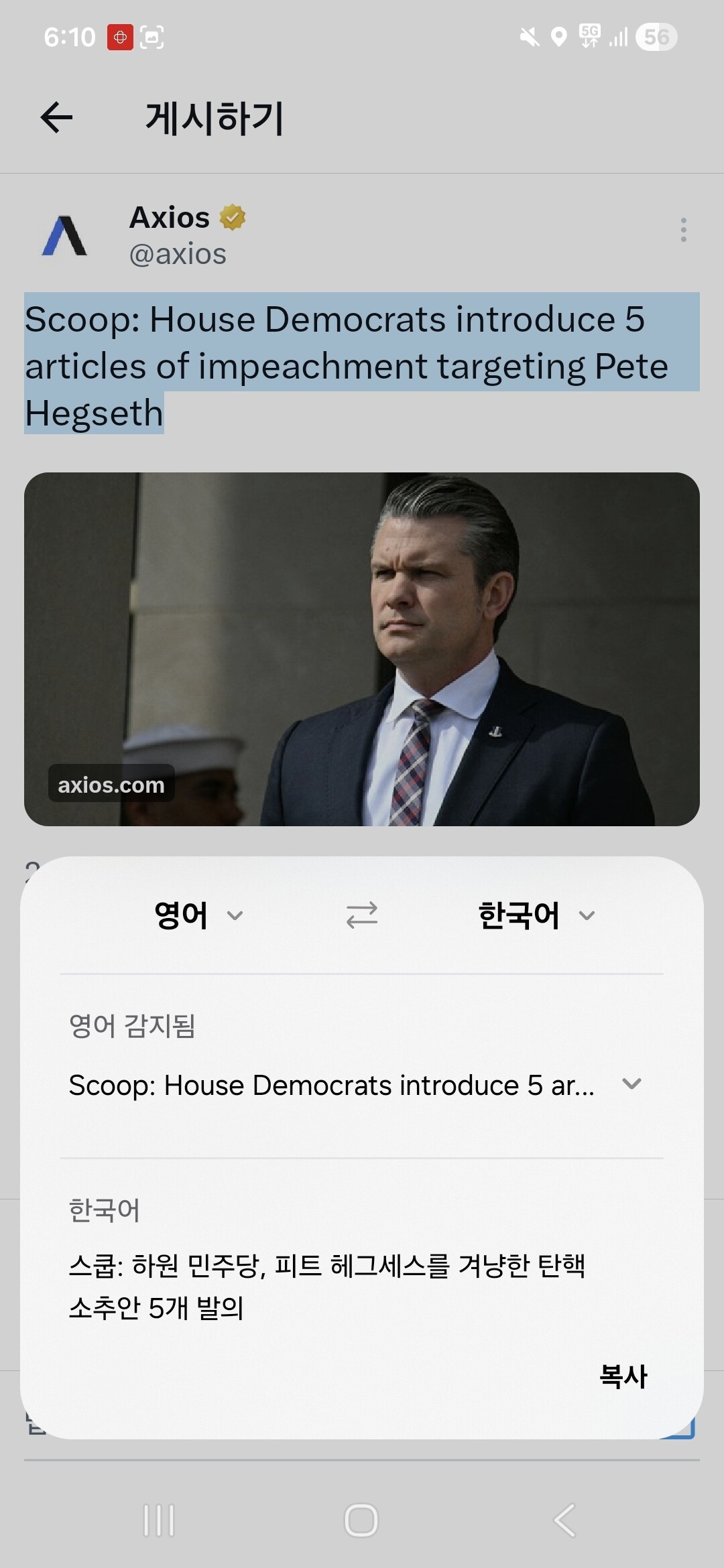 전쟁부 장관 탄핵소추안 발의